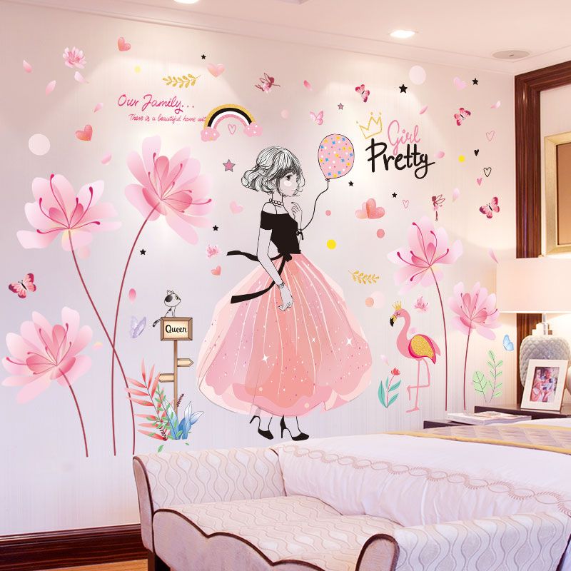 Shijuekongjian Pink Color Flowers Wall Stickers Diy Cartoon Girl
