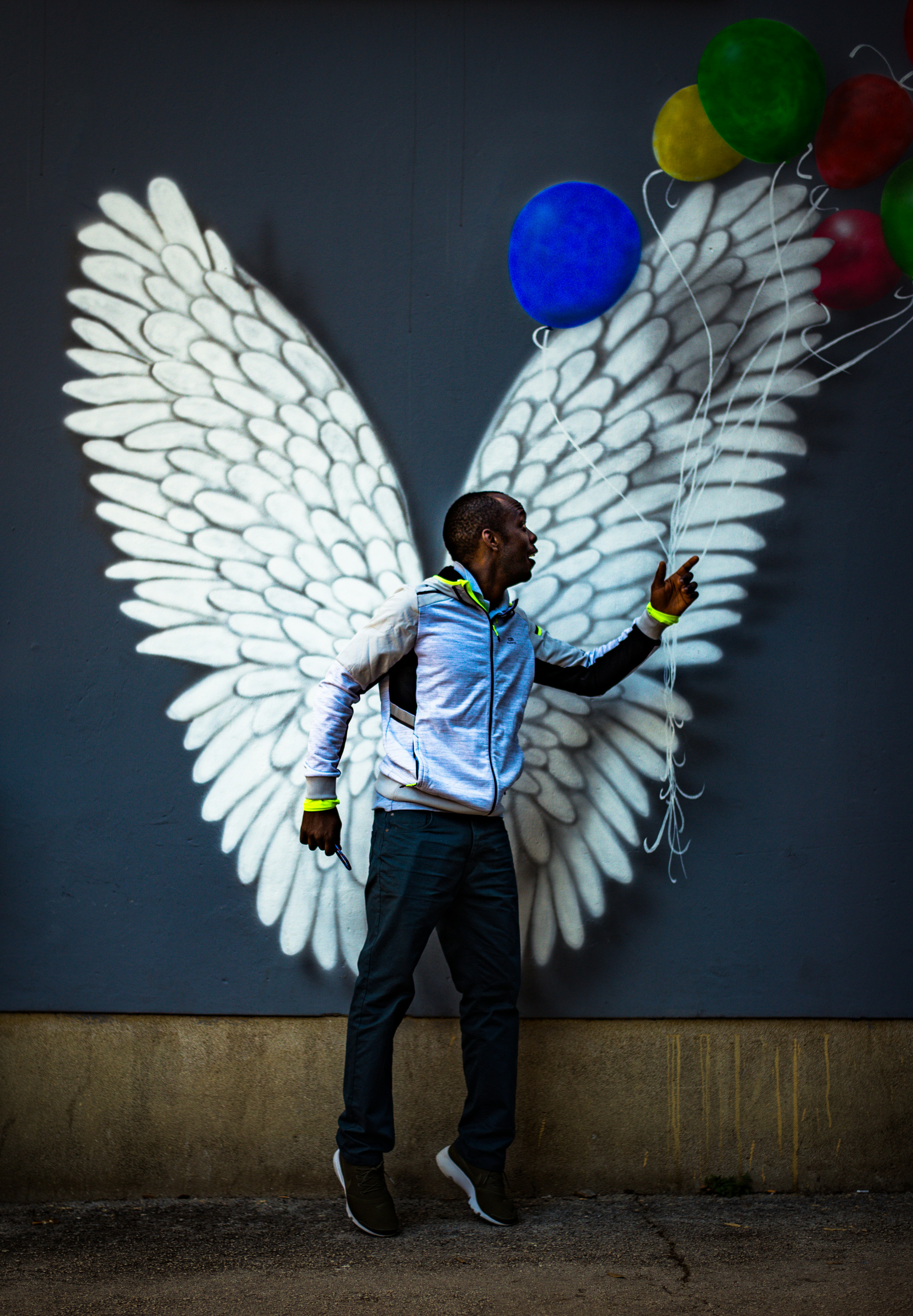 Man Standing In Front Of White Wings And Assorted Color Balloons Graffiti On Wall Photo Free Human Image On Unsplash