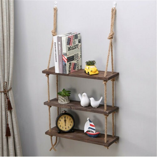 Floating Shelves Wooden Shelf Unit With Rope Wall Hanging Sling